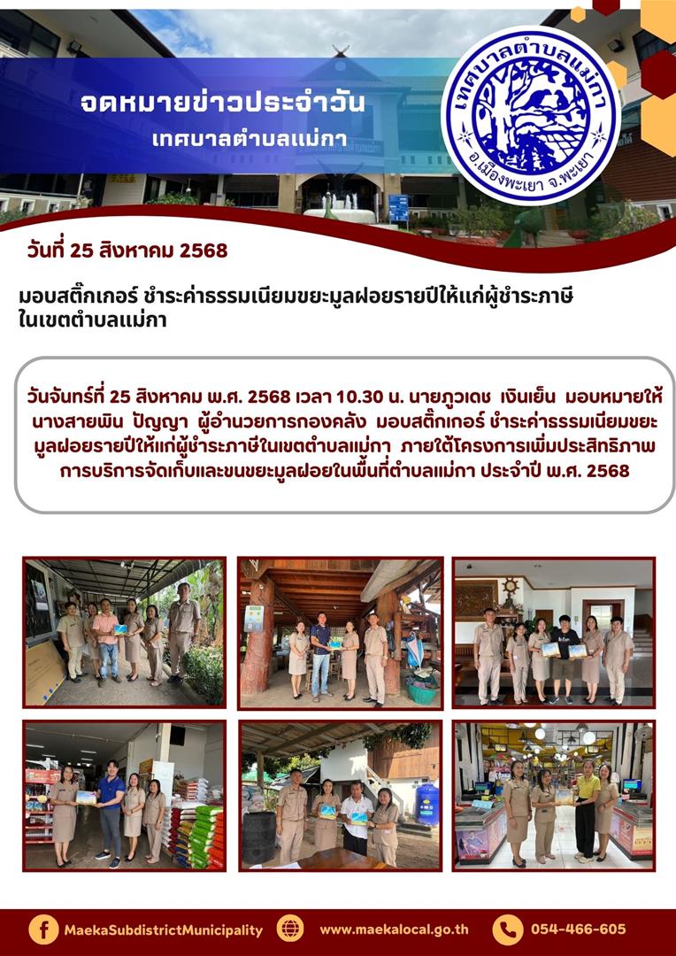 วันจันทร์ที่ 25 สิงหาคม พ.ศ. 2568 เวลา 10.30 น. นายภูวเดช เงินเย็น มอบหมายให้ นางสายพิน ปัญญา ผู้อำนวยการกองคลัง มอบสติ๊กเกอร์ ชำระค่าธรรมเนียมขยะมูลฝอยรายปีให้แก่ผู้ชำระภาษีในเขตตำบลแม่กา ภายใต้โครงการเพิ่มประสิทธิภาพการบริการจัดเก็บและขนขยะมูลฝอยในพื้นที่ตำบลแม่กา ประจำปี พ.ศ. 2568