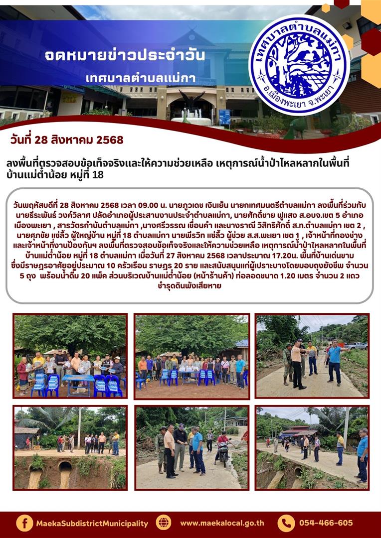 วันพฤหัสบดีที่ 28 สิงหาคม 2568 เวลา 09.00 น. นายภูวเดช เงินเย็น นายกเทศมนตรีตำบลแม่กา ลงพื้นที่ร่วมกับ นายธีระพันธ์ วงค์วิลาศ ปลัดอำเภอผู้ประสานงานประจำตำบลแม่กา, นายศักดิ์ชาย ฟูแสง ส.อบจ.เขต 5 อำเภอเมืองพะเยา , สารวัตรกำนันตำบลแม่กา ,นางศรีวรรณ เขื่อนคำ และนางราณี วิสิทธิศักดิ์ ส.ท.ตำบลแม่กา เขต 2 , นายศุภชัย แซ่ลิ้ว ผู้ใหญ่บ้าน หมู่ที่ 18 ตำบลแม่กา นายพีรวิท แซ่ลิ้ว ผู้ช่วย ส.ส.พะเยา เขต 1 , เจ้าหน้าที่กองช่าง และเจ้าหน้าที่งานป้องกันฯ ลงพื้นที่ตรวจสอบข้อเท็จจริงและให้ความช่วยเหลือ เหตุการณ์น้ำป่าไหลหลากในพื้นที่บ้านแม่ต๋ำน้อย หมู่ที่ 18 ตำบลแม่กา เมื่อวันที่ 27 สิงหาคม 2568 เวลาประมาณ 17.20น. พื้นที่บ้านเด่นขาม ซึ่งมีราษฎรอาศัยอยู่ประมาณ 10 ครัวเรือน ราษฎร 20 ราย และสนับสนุนแก่ผู้เปราะบางโดยมอบถุงยังชีพ จำนวน 5 ถุง พร้อมน้ำดื่ม 20 แพ็ค ส่วนบริเวณบ้านแม่ต๋ำน้อย (หน้าร้านค้า) ท่อลอดขนาด 1.20 เมตร จำนวน 2 แถว ชำรุดดินพังเสียหาย