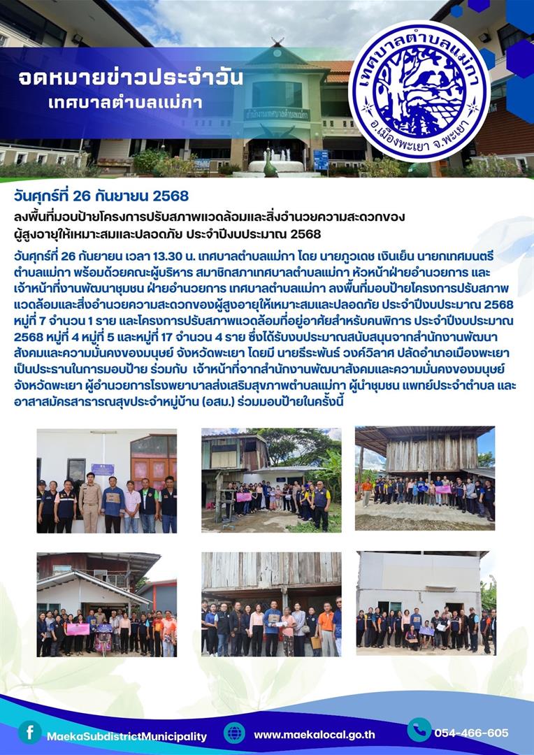 วันศุกร์ที่ 26 กันยายน เวลา 13.30 น. เทศบาลตำบลเเม่กา โดย นายภูวเดช เงินเย็น นายกเทศมนตรีตำบลแม่กา พร้อมด้วยคณะผู้บริหาร สมาชิกสภาเทศบาลตำบลแม่กา หัวหน้าฝ่ายอำนวยการ เเละ เจ้าหน้าที่งานพัฒนาชุมชน ฝ่ายอำนวยการ เทศบาลตำบลเเม่กา ลงพื้นที่มอบป้ายโครงการปรับสภาพแวดล้อมและสิ่งอำนวยความสะดวกของผู้สูงอายุให้เหมาะสมและปลอดภัย ประจำปีงบประมาณ 2568 หมู่ที่ 7 จำนวน 1 ราย เเละโครงการปรับสภาพเเวดล้อมที่อยู่อาศัยสำหรับคนพิการ ประจำปีงบประมาณ 2568 หมู่ที่ 4 หมู่ที่ 5 เเละหมู่ที่ 17 จำนวน 4 ราย ซึ่งได้รับงบประมาณสนับสนุนจากสำนักงานพัฒนาสังคมเเละความมั่นคงของมนุษย์ จังหวัดพะเยา โดยมี นายธีระพันธ์ วงค์วิลาศ ปลัดอำเภอเมืองพะเยา เป็นประธานในการมอบป้าย ร่วมกับ เจ้าหน้าที่จากสำนักงานพัฒนาสังคมเเละความมั่นคงของมนุษย์จังหวัดพะเยา ผู้อำนวยการโรงพยาบาลส่งเสริมสุขภาพตำบลเเม่กา ผู้นำชุมชน เเพทย์ประจำตำบล เเละอาสาสมัครสาธารณสุขประจำหมู่บ้าน (อสม.) ร่วมมอบป้ายในครั้งนี้