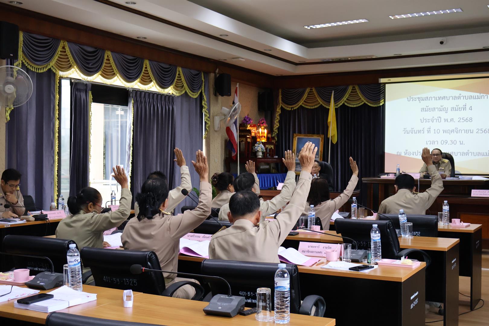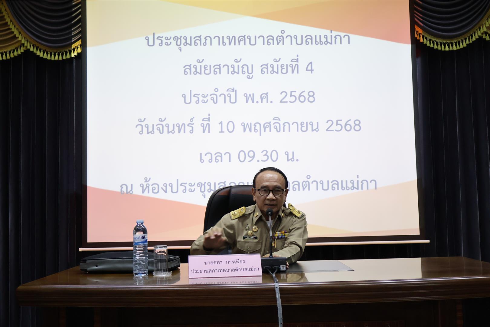 วันจันทร์ที่ 10 พฤศจิกายน 2568 นายคทา การเพียร ประธานสภาเทศบาลตำบลแม่กา ทำหน้าที่ประธานในที่ประชุมสภาเทศบาลตำบลแม่กา สมัยสามัญ สมัยที่ 4 ประจำปี พ.ศ. 2568 เพื่อพิจารณาให้ความเห็นเทศบัญญัติงบประมาณรายจ่าย ประจำปีงบประมาณ พ.ศ.2568 และที่ประชุมมีมติเห็นชอบในญัตติต่าง ๆ ตาม?หน้าที่และอำนาจของเทศบาลตำบลแม่กา? จำนวน 6 ญัตติ ตามที่นายภูวเดช เงินเย็น นายกเทศมนตรีตำบลแม่กา? เสนอ โดยมีสมาชิกสภาเทศบาลตำบลแม่กา คณะผู้บริหาร ปลัดเทศบาลตำบลแม่กา หัวหน้าส่วนราชการ และเจ้าหน้าที่ผู้เกี่ยวข้อง เข้าร่วมประชุม ณ ห้องประชุมสภาเทศบาลตำบลแม่กา อำเภอเมืองพะเยา จังหวัดพะเยา