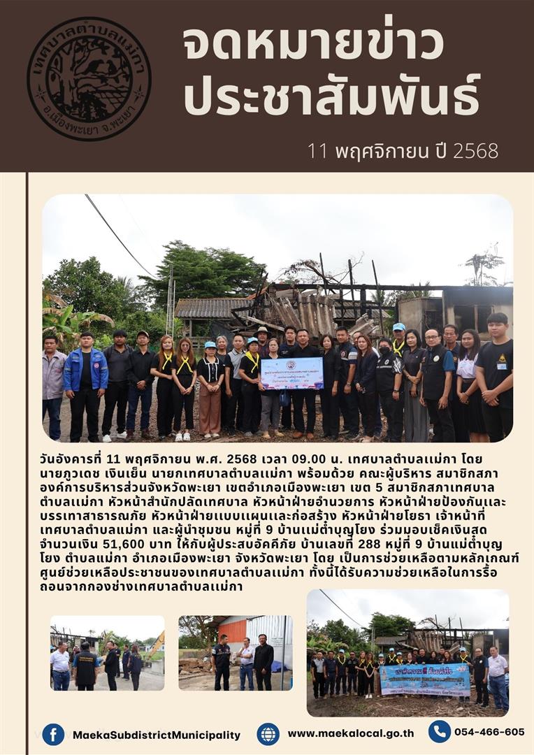 วันอังคารที่ 11 พฤศจิกายน พ.ศ. 2568 เวลา 09.00 น. เทศบาลตำบลเเม่กา โดย นายภูวเดช เงินเย็น นายกเทศบาลตำบลเเม่กา พร้อมด้วย คณะผู้บริหาร สมาชิกสภาองค์การบริหารส่วนจังหวัดพะเยา เขตอำเภอเมืองพะเยา เขต 5 สมาชิกสภาเทศบาลตำบลเเม่กา หัวหน้าสำนักปลัดเทศบาล หัวหน้าฝ่ายอำนวยการ หัวหน้าฝ่ายป้องกันเเละบรรเทาสาธารณภัย หัวหน้าฝ่ายเเบบเเผนเเละก่อสร้าง หัวหน้าฝ่ายโยธา เจ้าหน้าที่เทศบาลตำบลแม่กา และผู้นำชุมชน หมู่ที่ 9 บ้านเเม่ต๋ำบุญโยง ร่วมมอบเช็คเงินสด จำนวนเงิน 51,600 บาท ให้กับผู้ประสบอัคคีภัย บ้านเลขที่ 288 หมู่ที่ 9 บ้านแม่ต๋ำบุญโยง ตำบลแม่กา อำเภอเมืองพะเยา จังหวัดพะเยา โดย เป็นการช่วยเหลือตามหลักเกณฑ์ศูนย์ช่วยเหลือประชาชนของเทศบาลตำบลเเม่กา ทั้งนี้ได้รับความช่วยเหลือในการรื้อถอนจากกองช่างเทศบาลตำบลเเม่กา