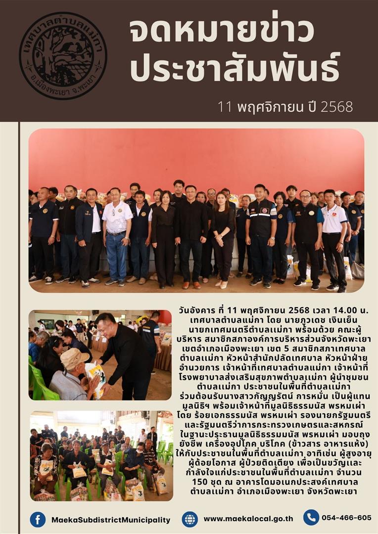 วันอังคาร ที่ 11 พฤศจิกายน 2568 เวลา 14.00 น. เทศบาลตำบลแม่กา โดย นายภูวเดช เงินเย็น นายกเทศมนตรีตำบลเเม่กา พร้อมด้วย คณะผู้บริหาร สมาชิกสภาองค์การบริหารส่วนจังหวัดพะเยา เขตอำเภอเมืองพะเยา เขต 5 สมาชิกสภาเทศบาลตำบลเเม่กา หัวหน้าสำนักปลัดเทศบาล หัวหน้าฝ่ายอำนวยการ เจ้าหน้าที่เทศบาลตำบลแม่กา เจ้าหน้าที่โรงพยาบาลส่งเสริมสุขภาพตำบลเเม่กา ผู้นำชุมชนตำบลเเม่กา ประชาชนในพื้นที่ตำบลเเม่กา ร่วมต้อนรับนางสาวกัญญรัตน์ การหมั่น เป็นผู้แทนมูลนิธิฯ พร้อมเจ้าหน้าที่มูลนิธิธรรมนัส พรหมเผ่า โดย ร้อยเอกธรรมนัส พรหมเผ่า รองนายกรัฐมนตรีและรัฐมนตรีว่าการกระทรวงเกษตรและสหกรณ์ ในฐานะประธานมูลนิธิธรรมมนัส พรหมเผ่า มอบถุงยังชีพ เครื่องอุปโภค บริโภค (ข้าวสาร อาหารแห้ง) ให้กับประชาชนในพื้นที่ตำบลเเม่กา อาทิเช่น ผู้สูงอายุ ผู้ด้อยโอกาส ผู้ป่วยติดเตียง เพื่อเป็นขวัญเเละกำลังใจแก่ประชาชนในพื้นที่ตำบลเเม่กา จำนวน 150 ชุด ณ อาคารโดมอเนกประสงค์เทศบาลตำบลเเม่กา อำเภอเมืองพะเยา จังหวัดพะเยา