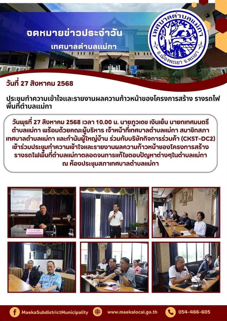 วันพุธที่ 27 สิงหาคม 2568 เวลา 10.00 น. นายภูวเดช เงินเย็น นายกเทศมนตรีตำบลแม่กา พร้อมด้วยคณะผู้บริหาร เจ้าหน้าที่เทศบาลตำบลเเม่กา สมาชิกสภาเทศบาล และกำนันผู้ใหญ่บ้าน ร่วมกับบริษัทกิจการร่วมค้า(CKST-DC2) เข้าร่วมประชุมทำความเข้าใจและรายงานผลความก้าวหน้าของโครงการสร้างรางรถไฟพื้นที่ตำบลแม่กาตลอดจนการแก้ไขตอบปัญหาต่างๆในตำบลแม่กา ณ ห้องประชุมสภาเทศบาลตำบลแม่กา