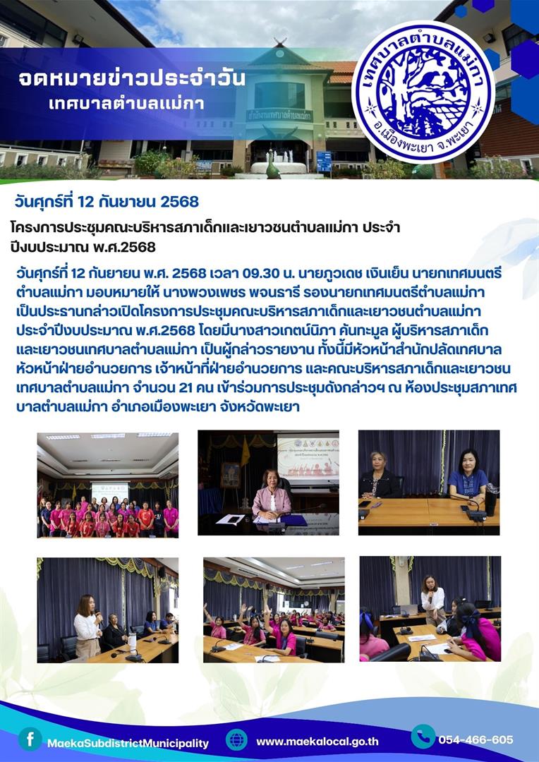 วันศุกร์ที่ 12 กันยายน พ.ศ. 2568 เวลา 09.30 น. นายภูวเดช เงินเย็น นายกเทศมนตรีตำบลแม่กา มอบหมายให้ นางพวงเพชร พจนธารี รองนายกเทศมนตรีตำบลแม่กา เป็นประธานกล่าวเปิดโครงการประชุมคณะบริหารสภาเด็กและเยาวชนตำบลแม่กา ประจำปีงบประมาณ พ.ศ.2568 โดยมีนางสาวเกตน์นิภา คันทะมูล ผู้บริหารสภาเด็กเเละเยาวชนเทศบาลตำบลเเม่กา เป็นผู้กล่าวรายงาน ทั้งนี้มีหัวหน้าสำนักปลัดเทศบาล หัวหน้าฝ่ายอำนวยการ เจ้าหน้าที่ฝ่ายอำนวยการ เเละคณะบริหารสภาเด็กเเละเยาวชนเทศบาลตำบลเเม่กา จำนวน 21 คน เข้าร่วมการประชุมดังกล่าวฯ ณ ห้องประชุมสภาเทศบาลตำบลเเม่กา อำเภอเมืองพะเยา จังหวัดพะเยา