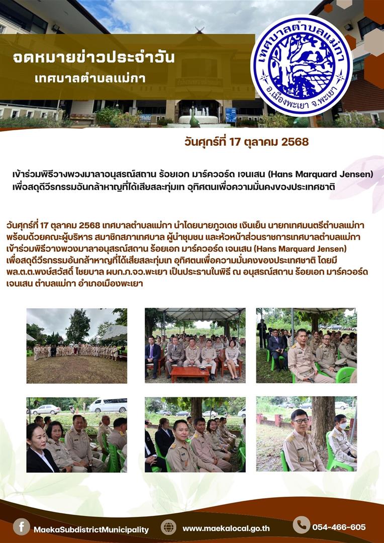วันศุกร์ที่ 17 ตุลาคม 2568 เทศบาลตำบลแม่กา นำโดยนายภูวเดช เงินเย็น นายกเทศมนตรีตำบลแม่กา พร้อมด้วยคณะผู้บริหาร สมาชิกสภาเทศบาล ผู้นำชุมชน และหัวหน้าส่วนราชการเทศบาลตำบลแม่กา เข้าร่วมพิธีวางพวงมาลาอนุสรณ์สถาน ร้อยเอก มาร์ควอร์ด เจนเสน (Hans Marquard Jensen) เพื่อสดุดีวีรกรรมอันกล้าหาญที่ได้เสียสละทุ่มเท อุทิศตนเพื่อความมั่นคงของประเทศชาติ โดยมี พล.ต.ต.พงษ์สวัสดิ์ ไชยบาล ผบก.ภ.จว.พะเยา เป็นประธานในพิธี ณ อนุสรณ์สถาน ร้อยเอก มาร์ควอร์ด เจนเสน ตำบลแม่กา อำเภอเมืองพะเยา