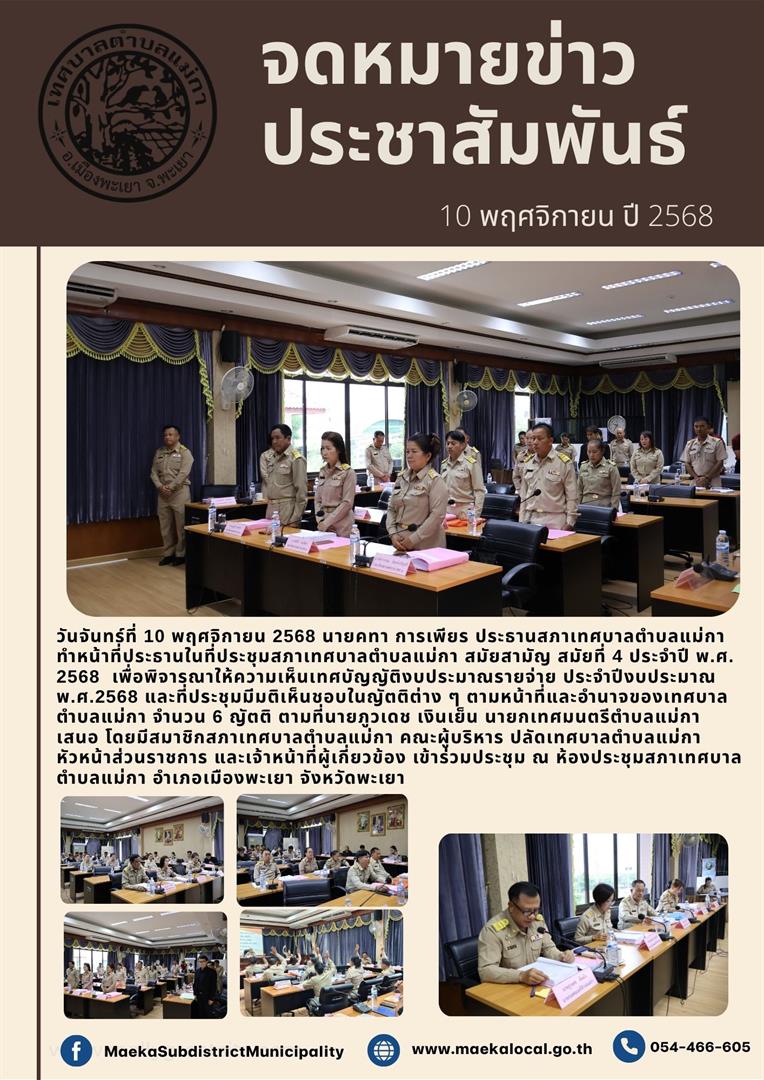 วันจันทร์ที่ 10 พฤศจิกายน 2568 นายคทา การเพียร ประธานสภาเทศบาลตำบลแม่กา ทำหน้าที่ประธานในที่ประชุมสภาเทศบาลตำบลแม่กา สมัยสามัญ สมัยที่ 4 ประจำปี พ.ศ. 2568 เพื่อพิจารณาให้ความเห็นเทศบัญญัติงบประมาณรายจ่าย ประจำปีงบประมาณ พ.ศ.2568 และที่ประชุมมีมติเห็นชอบในญัตติต่าง ๆ ตาม?หน้าที่และอำนาจของเทศบาลตำบลแม่กา? จำนวน 6 ญัตติ ตามที่นายภูวเดช เงินเย็น นายกเทศมนตรีตำบลแม่กา? เสนอ โดยมีสมาชิกสภาเทศบาลตำบลแม่กา คณะผู้บริหาร ปลัดเทศบาลตำบลแม่กา หัวหน้าส่วนราชการ และเจ้าหน้าที่ผู้เกี่ยวข้อง เข้าร่วมประชุม ณ ห้องประชุมสภาเทศบาลตำบลแม่กา อำเภอเมืองพะเยา จังหวัดพะเยา