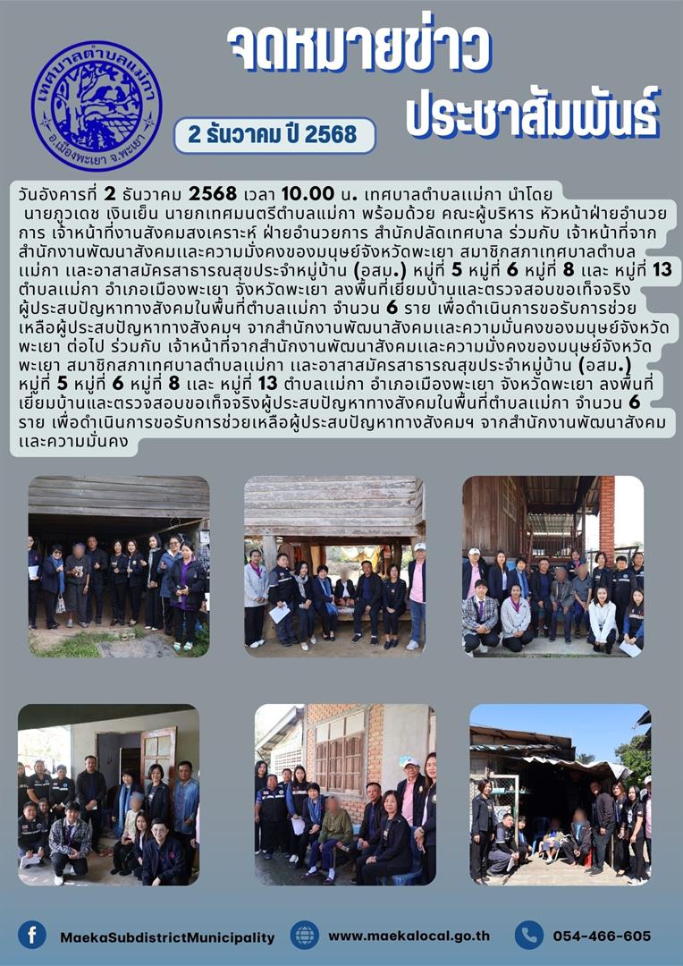 วันอังคารที่ 2 ธันวาคม 2568 เวลา 10.00 น. เทศบาลตำบลเเม่กา นำโดย นายภูวเดช เงินเย็น นายกเทศมนตรีตำบลแม่กา พร้อมด้วย คณะผู้บริหาร หัวหน้าฝ่ายอำนวยการ เจ้าหน้าที่งานสังคมสงเคราะห์ ฝ่ายอำนวยการ สำนักปลัดเทศบาล ร่วมกับ เจ้าหน้าที่จากสำนักงานพัฒนาสังคมเเละความมั่งคงของมนุษย์จังหวัดพะเยา สมาชิกสภาเทศบาลตำบลเเม่กา เเละอาสาสมัครสาธารณสุขประจำหมู่บ้าน (อสม.) หมู่ที่ 5 หมู่ที่ 6 หมู่ที่ 8 เเละ หมู่ที่ 13 ตำบลเเม่กา อำเภอเมืองพะเยา จังหวัดพะเยา ลงพื้นที่เยี่ยมบ้านและตรวจสอบขอเท็จจริงผู้ประสบปัญหาทางสังคมในพื้นที่ตำบลเเม่กา จำนวน 6 ราย เพื่อดำเนินการขอรับการช่วยเหลือผู้ประสบปัญหาทางสังคมฯ จากสำนักงานพัฒนาสังคมเเละความมั่นคงของมนุษย์จังหวัดพะเยา ต่อไป ร่วมกับ เจ้าหน้าที่จากสำนักงานพัฒนาสังคมเเละความมั่งคงของมนุษย์จังหวัดพะเยา สมาชิกสภาเทศบาลตำบลเเม่กา เเละอาสาสมัครสาธารณสุขประจำหมู่บ้าน (อสม.) หมู่ที่ 5 หมู่ที่ 6 หมู่ที่ 8 เเละ หมู่ที่ 13 ตำบลเเม่กา อำเภอเมืองพะเยา จังหวัดพะเยา ลงพื้นที่เยี่ยมบ้านและตรวจสอบขอเท็จจริงผู้ประสบปัญหาทางสังคมในพื้นที่ตำบลเเม่กา จำนวน 6 ราย เพื่อดำเนินการขอรับการช่วยเหลือผู้ประสบปัญหาทางสังคมฯ จากสำนักงานพัฒนาสังคมเเละความมั่นคง